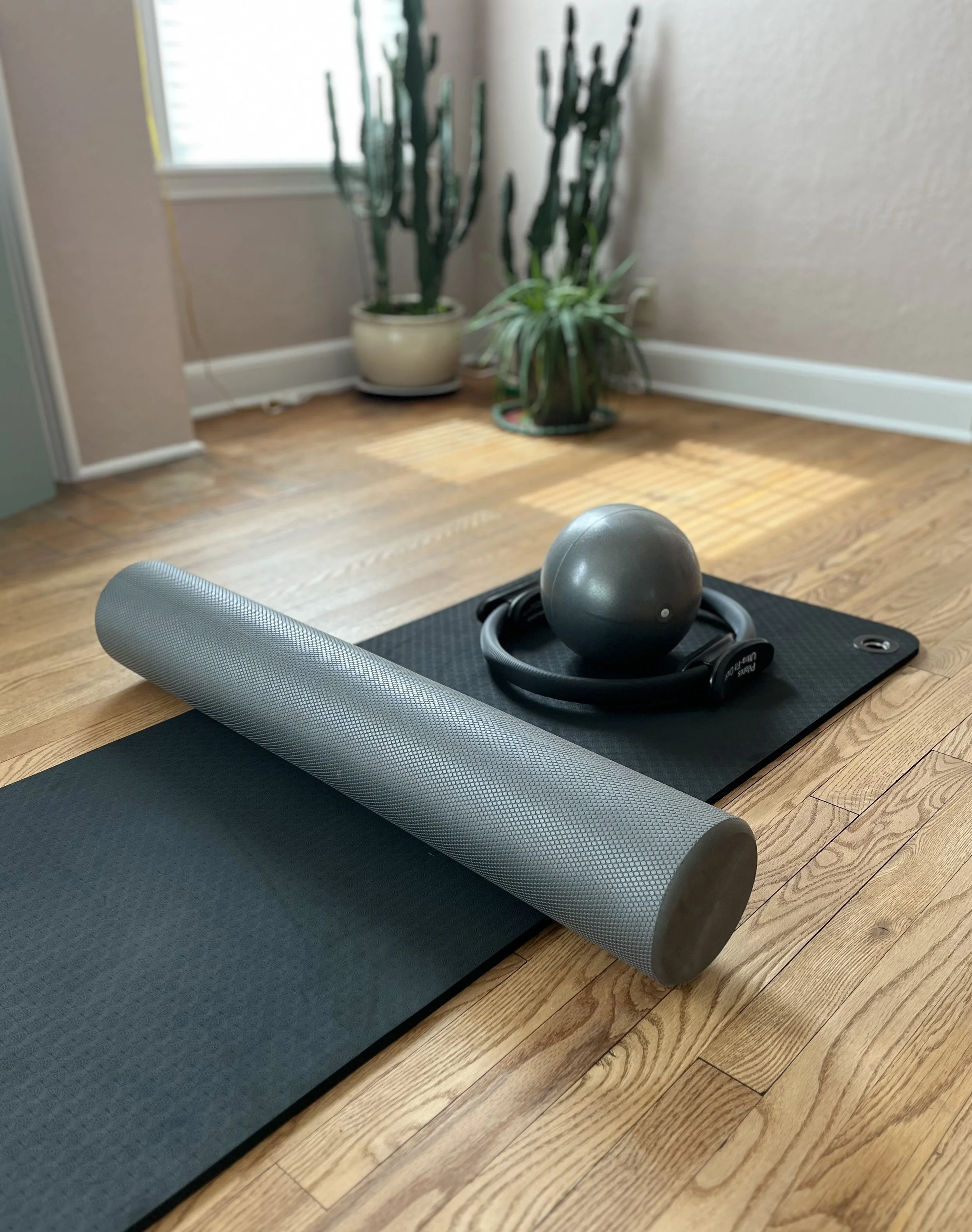 Both Mat Class options may incorporate the use of props, including a foam roller, small weights, therabands, and the Pilates Ultra-Fit Circle